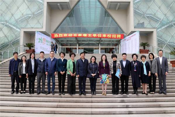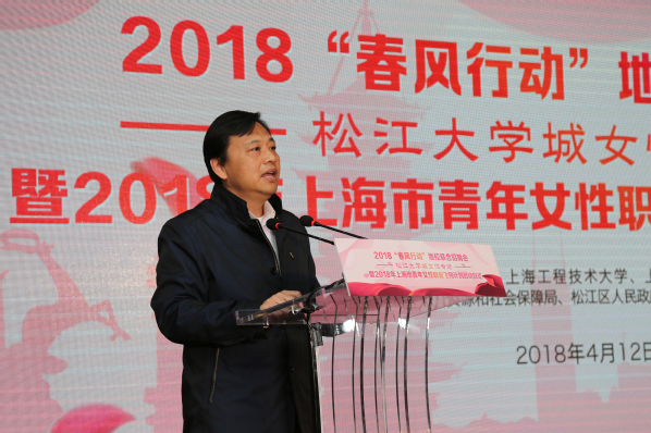 为进一步推进地校共享共建,协同促进大学生就业,更好发挥妇女组织团结、服务和凝聚女性的作用,4月12日中午,2018年乐业上海“春风行动”地校联合春季招聘会(女性专场)暨2018年上海市青年女性职业飞翔计划启动仪式在我校松江校区图文信息中心第二报告厅隆重举行。上海市妇联副主席黎荣,松江区政府副区长龙婉丽,校党委副书记、工会主席史健勇,上海市就业促进中心副主任沈浩,上海市教育系统妇工委副主任、上海市教育工会女工部部长彭超波出席会议,上海市妇女干部学校、松江大学城服务中心、区妇联、区人社局、广富林街道分管领导,松江区各街道妇女干部、大学城各高校工会、妇工委/妇委会负责人以及女大学生代表与会。