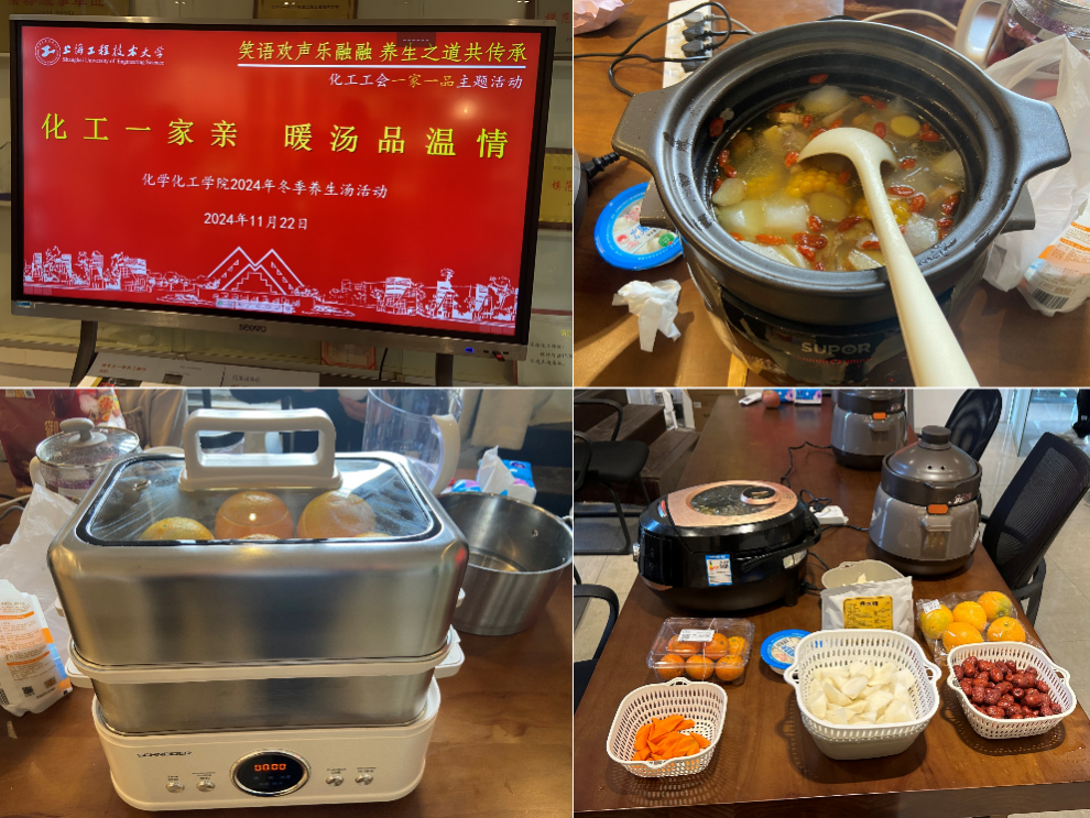 化工一家亲,暖汤品温情。为了提升教职工的团队凝聚力,促进彼此间的交流与合作,并普及健康养生知识,2024年11月22日中午12点,化学化工学院工会在学院四楼教工小家成功举办了一场冬季养生汤烹饪活动,此次活动得到了教职工的热情参与。