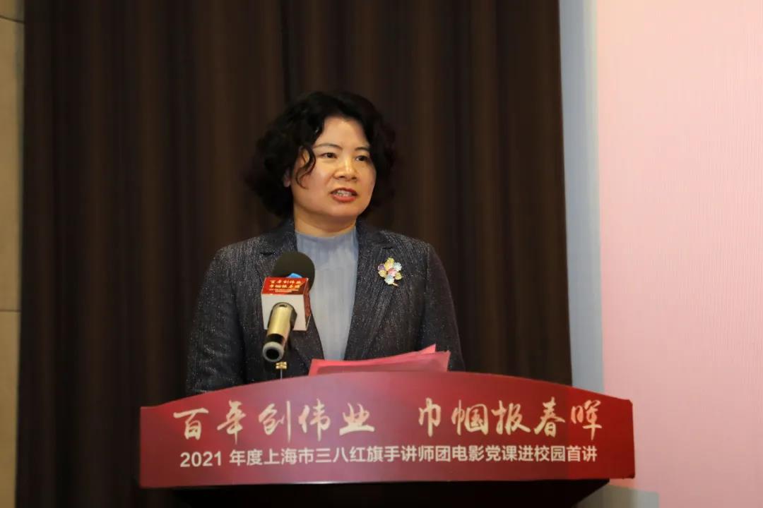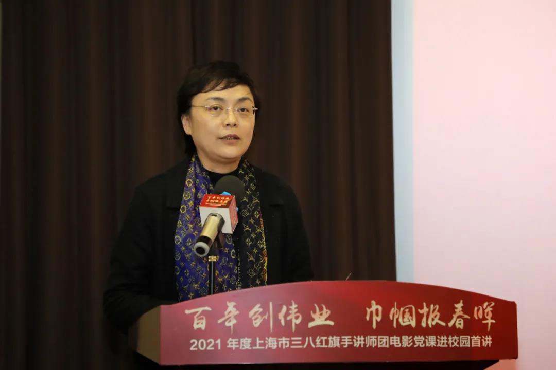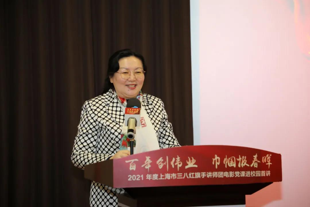 上海市妇联副主席翁文磊发表讲话。她表示,“电影党课”是“百年创伟业 巾帼报春晖”市三八红旗手讲师团系列宣讲活动主要形式之一,通过解读百年来中国电影中塑造的经典女性形象,生动展现中国共产党领导下妇女解放运动艰辛而辉煌的奋斗历程。学党史,不仅是要以史为鉴,更要向史而新,学出信仰担当,做到学史明理、学史增信、学史崇德、学史力行,赋予上海女性时代精神新的历史内涵,为奋力创造新时代上海发展新奇迹贡献巾帼力量。