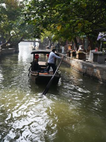 一路秋高气爽,艳阳高照。古镇水乡绿树环抱,层林尽染,游人如织。如此美景吸引着众多游客纷至沓来赏景留影,会员们也不例外。大家一到景点就拿出随时携带的“长枪短炮”开始各自的创作。写满历史沧桑的青石,各式古朴的石桥,独特的白墙黑瓦建筑,依水而建的房屋,弯曲的河流,着蓝印花布边摇桨边歌唱的村妇,斑驳的树影,路边阳光下的铁壶,人流中的胡同,一一都被捕捉到大家的镜头里,成为每个人第一次的拍摄作品。随后大家三三两两聚在一起,彼此展示交流。会长朱翔因摄影系毕业,时不时在现场教授大家相关摄影理论,或指点拍摄取景,或讲解图片构图,或分析现场光影,听者无不收益,收获颇丰。