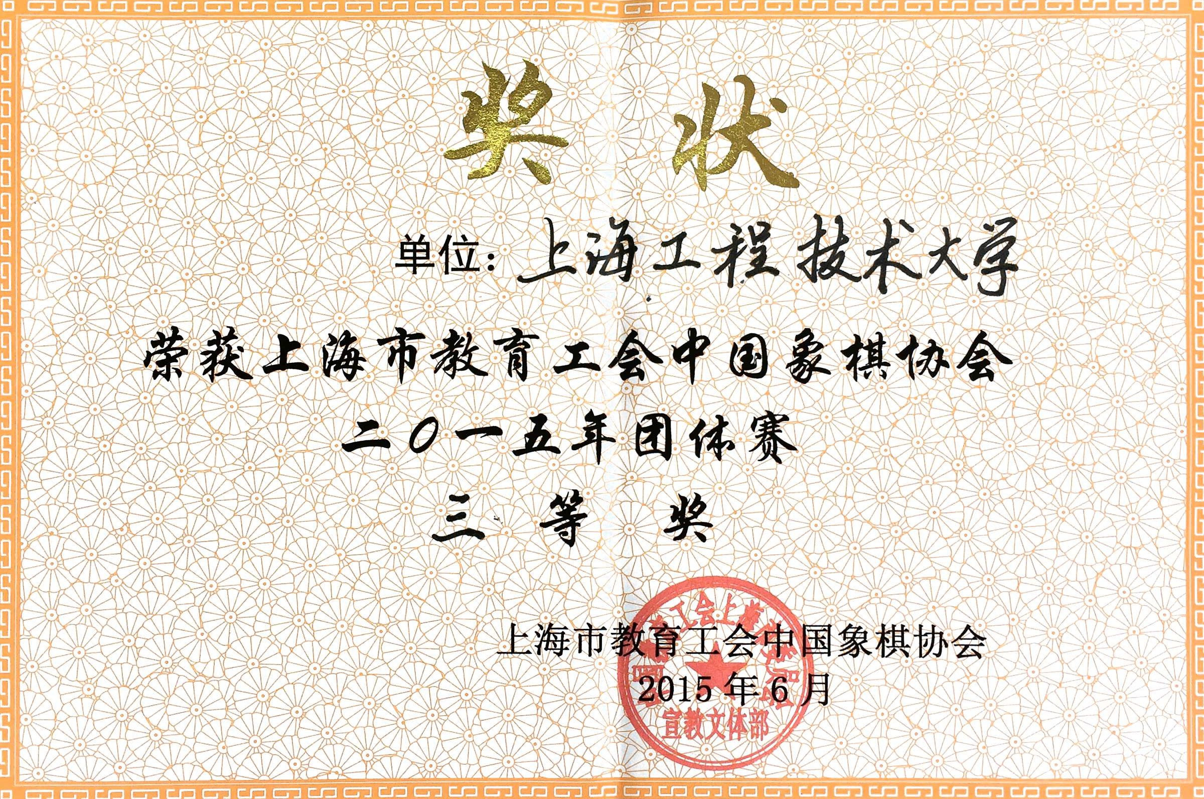 在2015年6月13日上午举行的上海市教育工会中国象棋协会2015年团体赛上,我校教师因出色表现被授予2015年团体赛三等奖,其中,机械工程学院崔岩老师获得精英赛参赛资格。我校教工棋牌协会成立于2014年,是一个新新社团。此次获奖刷新了我校教工在该项赛事中的最佳历史纪录。